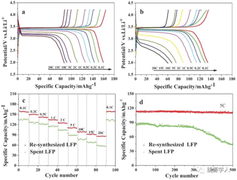 Figure8. 再生LFP和廢棄LFP材料在2.0–4.2 V電壓區(qū)間內的電化學性能: a)再生LFP和b)廢棄LFP材料在從0.1到20 C不同電流密度下的充放電曲線. c) 兩種材料在不同充電速率下的倍率性能和循環(huán)性能. d) 兩種材料在5 C 電流密度下的循環(huán)性能.