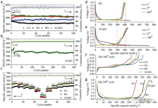 Figure9. a)商業(yè)石墨(CG), 廢棄石墨(SG), 再生石墨(RG), 無定形碳涂覆石墨(AC@G)電極在0.1 C時的循環(huán)性能. b) AC@G電極在0.5 C時的循環(huán)性能. c) CG, SG, RG,AC@G電極在不同電流密度下的倍率性能. d) RG和e) AC@G在0.1 C時的恒流充放電曲線. CG, SG, RG, andAC@G電極在0.1 C時的f) 100th充電平臺和g) 100th充放電平臺.