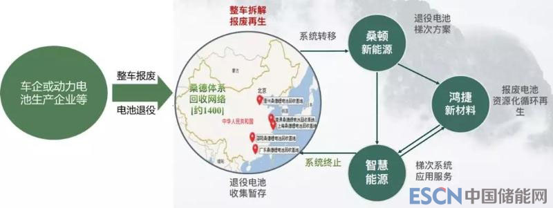 高度協(xié)同的梯次利用及再生產(chǎn)業(yè),包含收集網(wǎng)絡、梯次利用、梯次應用、循環(huán)再生4個環(huán)節(jié),以整車報廢、電池退役為可服務對象,流程如下: