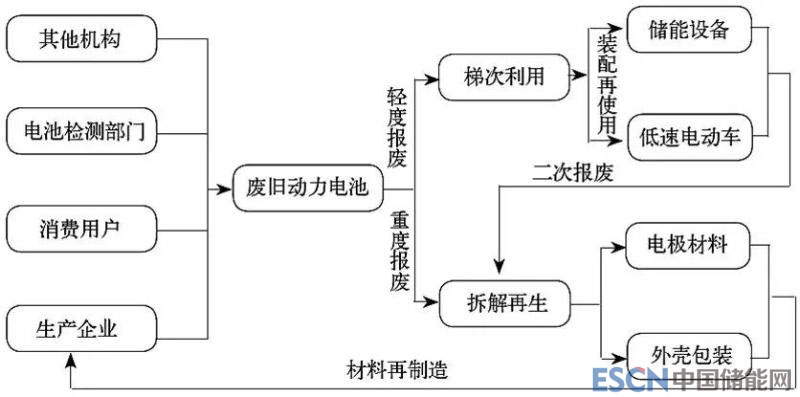 國內(nèi)動力電池主要回收利用流程。在生產(chǎn)企業(yè)、消費者、電池檢測部門及其他部門回收廢舊電池,根據(jù)輕度報廢和重度報廢,進行梯次利用(在儲能設備和低速電動車裝配再使用)和拆解再生。