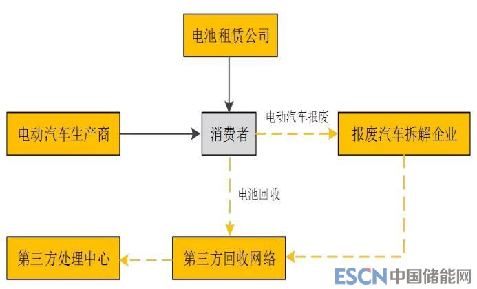 第三方為主體的動力電池回收模式獲取電池的途徑主要有2個,一是自建回收網(wǎng)絡和相關物流體系,負責回收委托企業(yè)售后市場生產(chǎn)的廢舊動力電池,之后運回回收處理中心,進行專業(yè)化的回收處理;另一個是在電動汽車最終報廢進入汽車拆解企業(yè)后,汽車拆解企業(yè)可以將廢舊動力電池銷售給第三方回收企業(yè)。