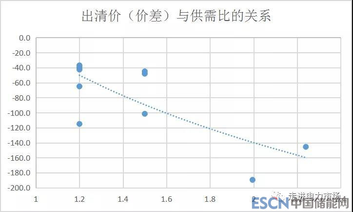 可以看到,2、3月份的出清價降價幅度非常大,達到-145.5厘/千瓦時和-189.5厘/千瓦時,這主要是由于供需比較大:2017年2月的供需比為2.24,3月供需比1.995。后面月份逐步調(diào)低供需比,從4月的1.5,逐步調(diào)整、穩(wěn)定到1.2,價格逐步穩(wěn)定到-40厘/千瓦時左右,每個月的實際出清價會隨整體供需情況、網(wǎng)絡(luò)狀況等有一定變化。圖2給出了出清價和供需比的散點圖??梢钥吹剑袌龀銮鍍r與供需比有很大的關(guān)系,通過控制供需比,可以有效的控制市場的出清價。