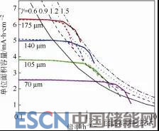 基于目前的電池技術(shù),功率型和能量型電池之間的主要區(qū)別是正極和負(fù)極的厚度。較厚的電極活性材料涂層通常會(huì)導(dǎo)致更高的能量密度,即以特定的質(zhì)量或體積存儲(chǔ)更高的能量。無論從電池包系統(tǒng)成本還是從駕駛里程的角度看,高能量密度的電池是理想的純電動(dòng)車電池。因此,在過去十年或更長時(shí)間內(nèi)的電池研發(fā)主要集中于提高電池的能量密度,即采用更高容量的材料和較厚的電極。然而,這樣的電池設(shè)計(jì)無法適應(yīng)XFC模式:與較薄的涂覆電極相比,在充電過快的情況下,較厚的電極會(huì)發(fā)生更迅速的衰減。較薄的電極雖然可以快速充放電,但電池的能量密度會(huì)下降。如圖7所示,小于100 μm的電極可以進(jìn)行高倍率充放電,大于100 μm的電極只能小倍率充放電。當(dāng)然影響電池倍率的設(shè)計(jì)因素有很多,這里只是用電極厚度來舉例說明。