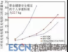 XFC對(duì)電動(dòng)車輛的配套設(shè)備/設(shè)施提出了一系列技術(shù)挑戰(zhàn)(如電纜、高壓電器和連接器等),其中最重要的挑戰(zhàn)是充電樁的類型(如交流、直流,或高壓、低壓)以及與現(xiàn)有設(shè)備/設(shè)施的兼容性,這個(gè)問題不僅是個(gè)技術(shù)問題,還涉及法規(guī)和標(biāo)準(zhǔn)的統(tǒng)一、以及滿足職業(yè)安全和健康管理等部門的規(guī)定。例如,現(xiàn)有常用充電電壓條件下快速充電的充電槍電纜線會(huì)超過15 kg/m,圖6顯示隨著功率水平的增加,布線重量明顯增加,會(huì)超過職業(yè)健康安全規(guī)定的個(gè)人舉重標(biāo)準(zhǔn)。使用更高的電壓可以顯著降低電纜線規(guī)尺寸,但提高電壓,也會(huì)伴隨產(chǎn)生其它問題,例如電池組的絕緣安全性、操作防護(hù)等等。當(dāng)然,XFC模式會(huì)改變很多電動(dòng)車相關(guān)的配套設(shè)備/設(shè)施,這里不一一例舉。就目前電動(dòng)車產(chǎn)業(yè)的工業(yè)技術(shù)水平,要實(shí)現(xiàn)XFC還需攻克下述難題:① 研發(fā)先進(jìn)材料或進(jìn)行技術(shù)改進(jìn),使電纜具有更好的熱性能和電性能,以減少設(shè)備/設(shè)施熱管理的熱負(fù)荷;② 研究XFC的自動(dòng)化充電樁;③ 研究適用于輕型乘用車的400 kW功率無線傳輸技術(shù)。