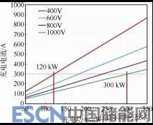 圖2 不同電池組電壓條件下,充電電流與充電功率間的關(guān)系,其中,400 V是當(dāng)前典型的電動(dòng)車電池組電壓(紅色線)