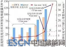 圖1 各種電動(dòng)汽車的直流快速充電(DCFC)功率及快速充電能力(km/min),以及XFC預(yù)期能力的比較。計(jì)算基于1 kW充電行駛5.6 km,或者1 km消耗177 W·h