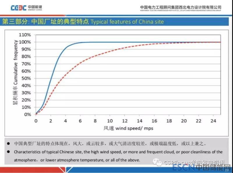 最后再?gòu)?qiáng)調(diào)一下風(fēng)的問(wèn)題,風(fēng)大的話集熱器設(shè)計(jì)成本比較高,比如上面這一組曲線,橫坐標(biāo)是風(fēng)速,縱坐標(biāo)是風(fēng)速累積頻率結(jié)果,兩個(gè)曲線代表兩個(gè)廠址。比如這個(gè)電站集熱器要確保99%的風(fēng)速下都可以工作,如果是紅色間斷線代表的廠址,那么這個(gè)地區(qū)風(fēng)比較大,會(huì)發(fā)現(xiàn)集熱器抗風(fēng)要求比較高,可能到15m/s或者更高,這里的風(fēng)速是10米高的平均風(fēng)速,跟外國(guó)常說(shuō)的3s陣風(fēng)的不太一樣,這里有個(gè)既定的轉(zhuǎn)化關(guān)系。而對(duì)于藍(lán)色實(shí)線代表的廠址,累積概率99%時(shí)對(duì)應(yīng)的風(fēng)大部分情況下都是6m/s以內(nèi),集熱器前期投資可以控制在比較低的水平。