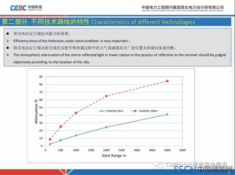 塔式電站有什么需要我們特別關(guān)注的問(wèn)題呢,就是在項(xiàng)目選擇的時(shí)候,我想有兩個(gè)關(guān)鍵因素需要提醒。一個(gè)是抗風(fēng)能力,因?yàn)樾陆苡幸恍┑貐^(qū)風(fēng)非常大,塔式電站定日鏡誤差,包括運(yùn)行中隨著不同的風(fēng)速,風(fēng)速越高誤差越大,會(huì)非常明顯的增大,導(dǎo)致性能下降。還有一個(gè)問(wèn)題,大氣清潔度問(wèn)題,比方說(shuō)這跟實(shí)線是5公里的可見(jiàn)度模型和虛線23公里可見(jiàn)度模型,橫坐標(biāo)是定日鏡距離吸熱器的距離,縱坐標(biāo)是大氣衰減量,比如說(shuō)100兆瓦的電站,最遠(yuǎn)的定日鏡距離吸熱器可能會(huì)到2000米,這里比較清潔的大氣條件模型下,反射鏡到吸熱器能量傳輸過(guò)程中,能量損失20%多。更糟糕的情況下是某個(gè)廠址某個(gè)季節(jié),或者全年空氣臟兮兮的,沙塵霧比較多就會(huì)更夸張,當(dāng)然實(shí)際中沒(méi)有這么夸張的清潔度,但是還是很重要的一個(gè)因素在選址的時(shí)候需要重視。日喀則大氣環(huán)境和德令哈、敦煌、玉門(mén)都不一樣,選擇的時(shí)候也是需要重視。