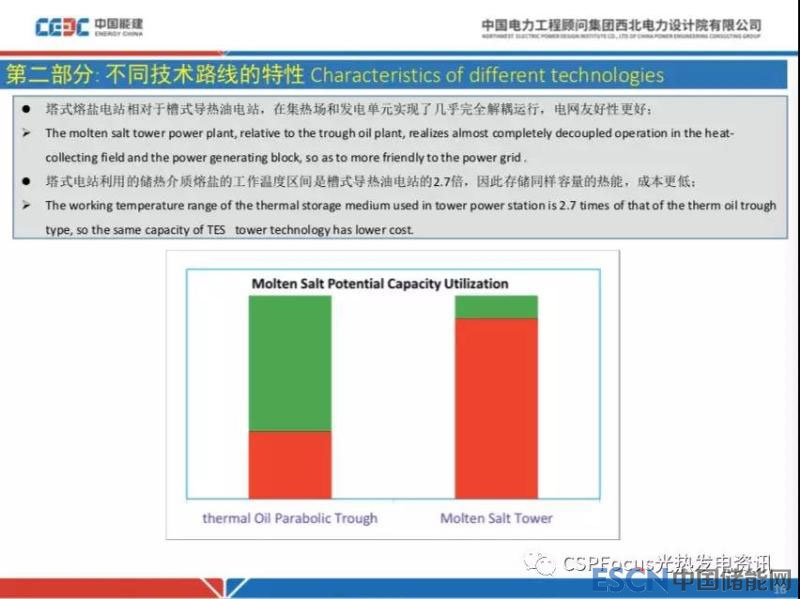 槽式和塔式都采用熔鹽作為儲(chǔ)熱介質(zhì),對(duì)于槽式電站溫度比較低,假設(shè)這根柱子高度代表熔融鹽總共儲(chǔ)能的能力(低溫不是按熔鹽凝固點(diǎn),是按照朗肯循環(huán)回?zé)嵯到y(tǒng)決定的,大概290度),紅色代表熔融鹽儲(chǔ)能能力的利用情況,槽式只利用了33%,塔式熔鹽電站利用了90%,我們?cè)?93度的槽式電站中采用熔鹽儲(chǔ)鹽,并沒(méi)有把熔鹽儲(chǔ)能更充分利用。為什么強(qiáng)度熔鹽這個(gè)問(wèn)題呢?我們知道國(guó)內(nèi)有一些項(xiàng)目,近年熔鹽成本高于前些年廣核德令哈項(xiàng)目招標(biāo)價(jià)30%,對(duì)100兆瓦的導(dǎo)熱油電站來(lái)說(shuō),這部分成本可能在2個(gè)多億,這就是一個(gè)比較致命的投資了。這么貴的東西要充分利用它才能更好地發(fā)覺(jué)其價(jià)值。