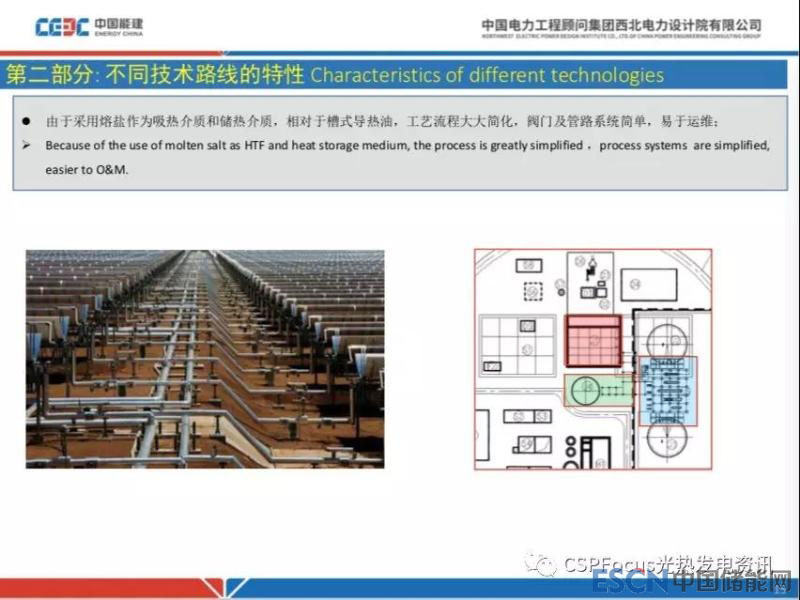 這是典型槽式電站的全廠管道工藝照片。想象一下50兆瓦槽式電站集熱管就需要120公里。塔式電站工藝系統(tǒng),包括發(fā)電、水、油鹽等系統(tǒng),布置比較緊湊,主要集中在儲(chǔ)換熱單元,還有儲(chǔ)換熱單元和發(fā)電單元連接之間的管架,以及吸熱塔,這一區(qū)域直徑范圍不過(guò)100米左右而已,因此從這個(gè)角度來(lái)講塔式電站這一塊優(yōu)越性表現(xiàn)良好。同樣的,前面提到槽式熔鹽電站,一個(gè)50MW的電站,管道太長(zhǎng),運(yùn)行階段的防凝成本較高,同時(shí)高溫熔鹽管道一般采用奧氏體不銹鋼,這部分投資可能要到上千萬(wàn)元。