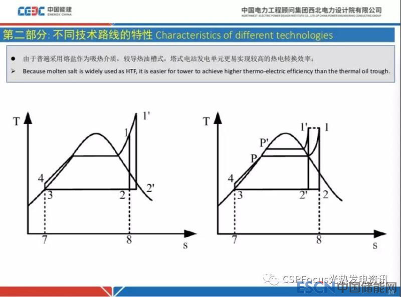 不同技術(shù)路線的特性,剛才談了前面光到熱環(huán)節(jié),后面熱到電的環(huán)節(jié)大家都比較清楚。由于普遍采用熔鹽作為吸熱介質(zhì),相比較槽式導(dǎo)熱油電站,塔式電站發(fā)電單元更容易實(shí)現(xiàn)較高的熱電轉(zhuǎn)換效率,這是一個(gè)典型的朗肯循環(huán)的圖,溫熵圖上面這段曲線右上角的點(diǎn)1和1’越高,做功介質(zhì)平均吸熱溫度越高,朗肯循環(huán)效率越高,這個(gè)很簡(jiǎn)單很成熟。同樣的道理,壓力越高右邊這張圖P和P’越高,一樣可實(shí)現(xiàn)較高的熱電效率。