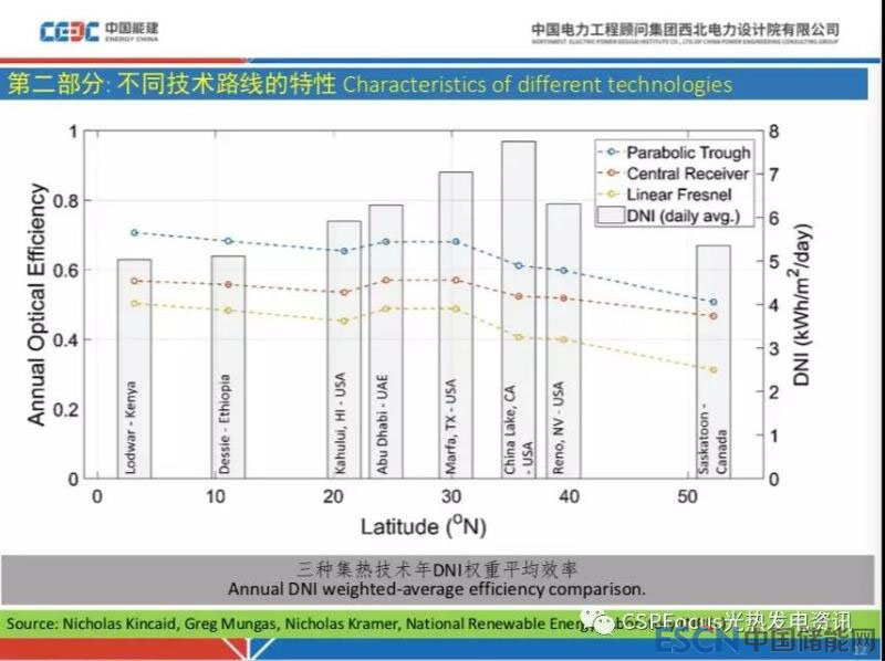 三種集熱技術(shù),考慮年DNI權(quán)重后的平均效率在全球范圍內(nèi)緯度來(lái)講,跟剛才分析一致,橫坐標(biāo)是緯度,縱坐標(biāo)是年光學(xué)效率,對(duì)于槽式電站來(lái)講,總體來(lái)說(shuō)隨著緯度升高往下降,而北緯36度區(qū)域表現(xiàn)為升高,表明DNI是結(jié)合實(shí)際DNI,它并不是一個(gè)純光學(xué)效率,因此結(jié)合廠址情況,結(jié)論不是絕對(duì)的。假如說(shuō)這個(gè)地方一點(diǎn)云都沒(méi)有,那么這個(gè)曲線肯定是直接往下走的,所以這就提醒我們實(shí)際中一定要結(jié)合實(shí)際的DNI等資源情況,這不是年總DNI那么簡(jiǎn)單,而且最好是若干年做的典型太陽(yáng)年數(shù)據(jù)來(lái)分析這個(gè)項(xiàng)目的經(jīng)濟(jì)性,這個(gè)很重要。