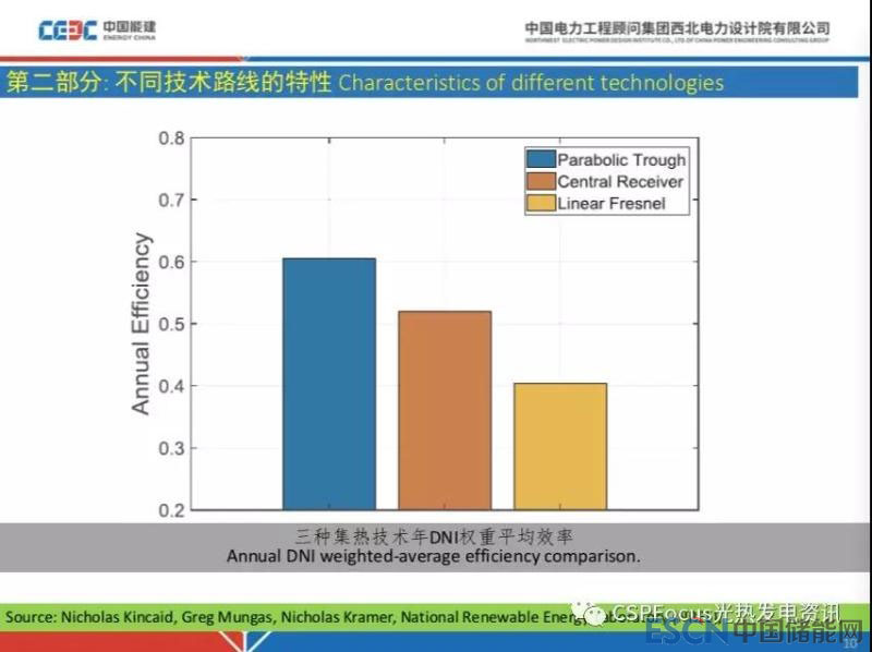 這是中國(guó)幾個(gè)典型光熱區(qū)域緯度情況,最高44度,最低的日喀則、格爾木、青海共和,大概30、36度,這些地方可能用槽式電站收益情況遠(yuǎn)遠(yuǎn)好于布置在哈密地區(qū)的同樣配置的槽式電站。世界上第一個(gè)配置大容量?jī)?chǔ)熱的槽式電站Andasol,緯度37度和中國(guó)德令哈的緯度相近。新月沙丘100MW塔式熔鹽電站所處38度,摩洛哥努奧槽式和塔式31度比較低,所以如果僅僅從效率講建設(shè)槽式電站比較好。同一個(gè)電站,搬到低緯度地區(qū),收益會(huì)很大。請(qǐng)不要忘記我們第一部分提到的各個(gè)技術(shù)路線對(duì)電網(wǎng)調(diào)度的適應(yīng)性。