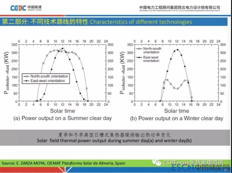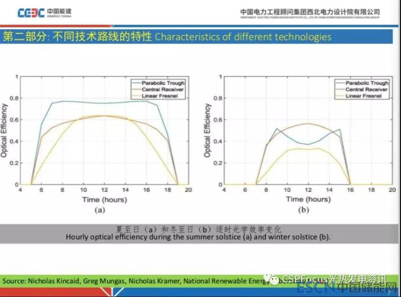 首先,上一組圖橫坐標(biāo)是某一天時(shí)刻數(shù),縱坐標(biāo)是不同技術(shù)路線光學(xué)效率,左邊的圖是夏至日曲線,右邊的圖是冬至日曲線,藍(lán)色是槽式,中間橙色是塔式,黃色是菲涅爾。這組曲線地理位置在北緯36度,跟西安差不多的地方,夏季槽式電站光到熱是很關(guān)鍵的步驟,由圖可見(jiàn),槽式具有比較明顯的更為優(yōu)越的光學(xué)效率,相應(yīng)的塔式電站低一些,菲涅爾一天當(dāng)中隨著時(shí)間推移效率變化是比較明顯的,就是表現(xiàn)為曲線的峰在時(shí)間維度比較窄,不像槽式和塔式很快可以達(dá)到較高效率,且能維持在較高效率環(huán)節(jié)較長(zhǎng)時(shí)間。