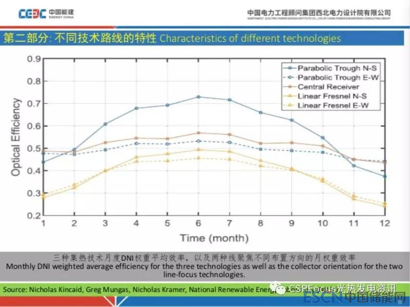 這組曲線告訴我們一個(gè)信息,從全年來(lái)講,槽式電站也是具有較高的光學(xué)效率,尤其是體現(xiàn)在6月份前后,光學(xué)效率比較高。塔式電站年度光學(xué)效率分布比較平穩(wěn),總體較槽式電站比較低。請(qǐng)注意這是基于一定緯度的地區(qū),邊界條件不同結(jié)果可能不同,不能得到普適性結(jié)論。