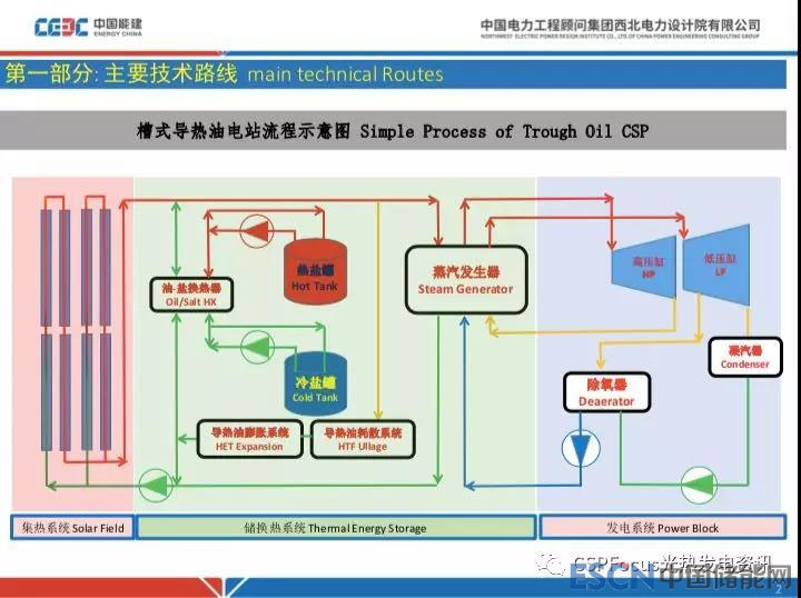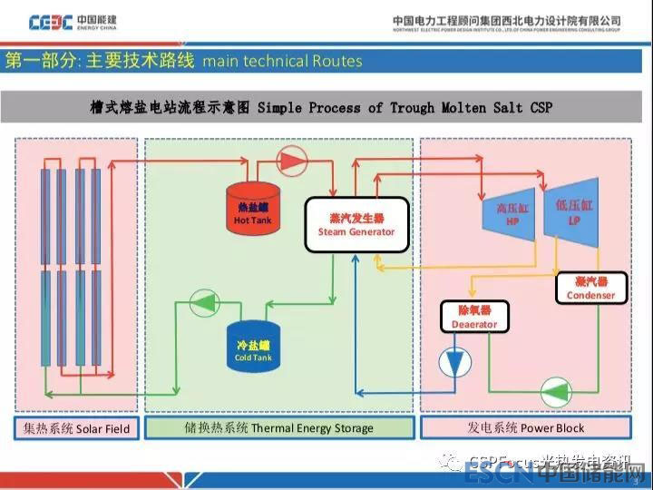 最為成熟的槽式導(dǎo)熱油帶儲(chǔ)熱電站,集熱場(chǎng)加熱后的導(dǎo)熱油溫度不是很高。大概290度導(dǎo)熱油進(jìn)集熱場(chǎng)之后經(jīng)過(guò)集熱器加熱到大概390度,首先優(yōu)先進(jìn)入到蒸汽發(fā)生器和水換熱產(chǎn)生蒸汽,驅(qū)動(dòng)汽輪機(jī)發(fā)電。當(dāng)集熱場(chǎng)產(chǎn)生的熱功率大于汽輪機(jī)所需要的功率時(shí)候,多余的能量進(jìn)儲(chǔ)換熱單元的油鹽換熱器,存儲(chǔ)在熔鹽中。熔鹽儲(chǔ)熱的時(shí)候冷的熔鹽通過(guò)低溫熔鹽泵循環(huán)吸熱,存儲(chǔ)在熱鹽罐里面,當(dāng)夜間的時(shí)候熱熔鹽通過(guò)高溫熔鹽泵,在同樣一個(gè)換熱器里面將熱量傳給導(dǎo)熱油,導(dǎo)熱油再把熱量傳輸給蒸汽發(fā)生器里面的水,以產(chǎn)生蒸汽來(lái)發(fā)電。