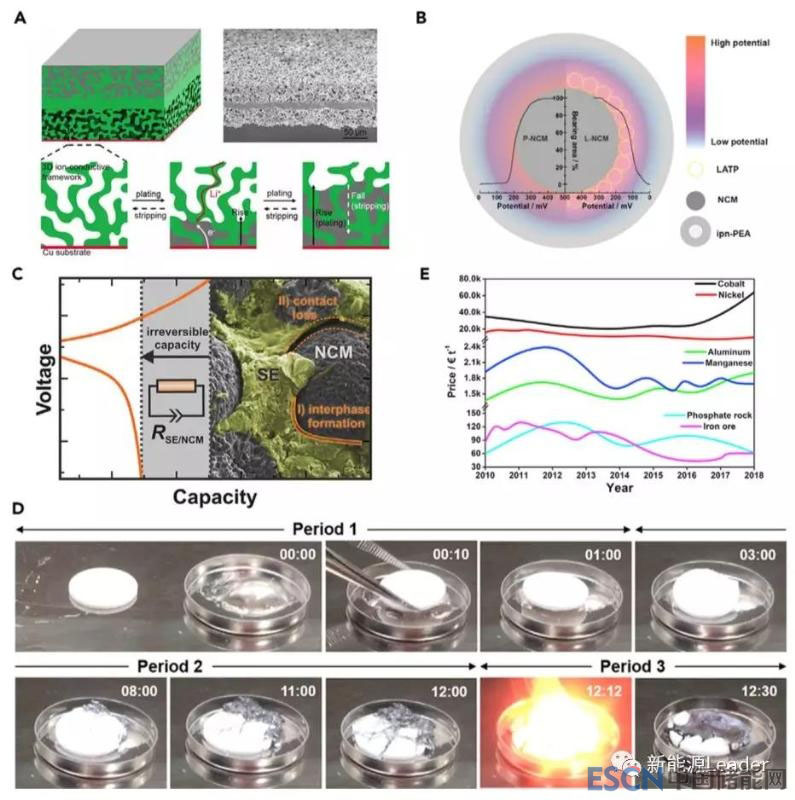 通常我們認為固態(tài)電解質(zhì)的安全性是其一大優(yōu)勢,特別是氧化物固態(tài)電解質(zhì)不具有可燃性,因此安全性要遠遠好于傳統(tǒng)的碳酸酯類電解液,但是Chung和Kang等人研究卻發(fā)現(xiàn)即便是全固態(tài)電池也存在熱失控的風險。首先他們將Li1.5Al0.5Ge1.5(PO4)3固態(tài)電解質(zhì)(熔點超過1100℃)壓成片,然后放入到熔化的金屬鋰(熔點180℃)之中(如下圖D所示),固態(tài)電解質(zhì)片首先會漂浮在金屬鋰的表面,然后固態(tài)電解質(zhì)片開始發(fā)生破碎和粉化,最后發(fā)生了熱失控。因此全固態(tài)電池固然安全性要好于碳酸酯類電解液,但是全固態(tài)電池仍然存在熱失控的風險,在全固態(tài)電池的設(shè)計和應(yīng)用中也需要充分考慮熱失控的風險。