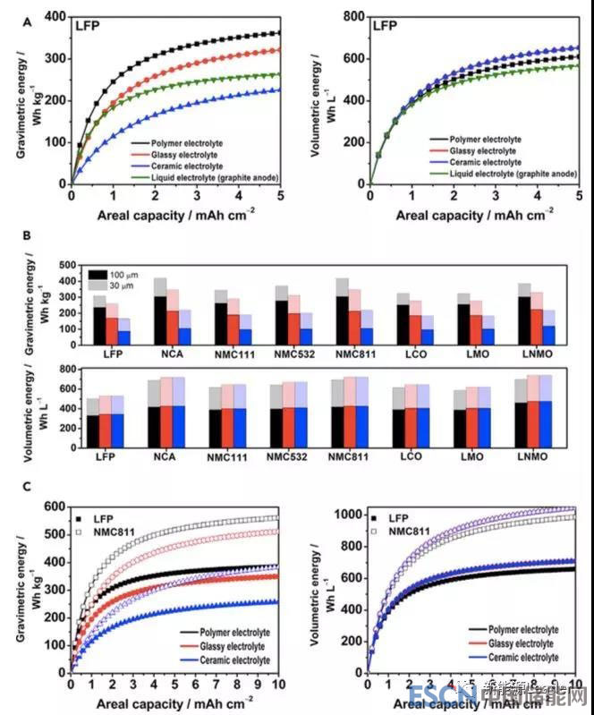 從下圖c我們能夠看到,NCM811材料是提升電池能量密度達到500Wh/kg以上,體積能量密度700Wh/L以上的關(guān)鍵,此外適當提升金屬鋰的負載量到4mAh/cm2也能有效提升電池能量密度,但是繼續(xù)提升負載量對于提升鋰離子電池能量密度的效果就不明顯了(注意這些數(shù)據(jù)都是在固態(tài)電解質(zhì)厚度在30um的前提下計算得到的)。