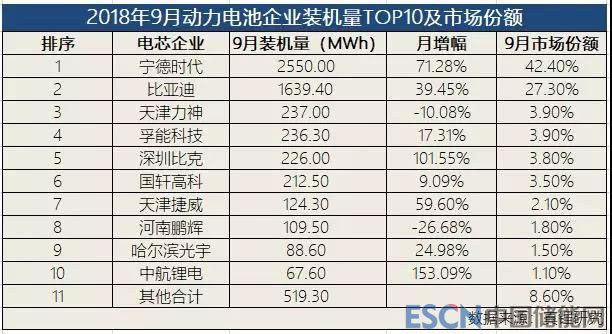 寧德時(shí)代吃掉的是誰的市場份額?排在后面的天津力神、孚能科技、深圳比克、國軒高科,這些電芯企業(yè)9月的裝機(jī)市場份額都只稍高于3%,而上個(gè)月他們的市場份額尚在4-7%之間。