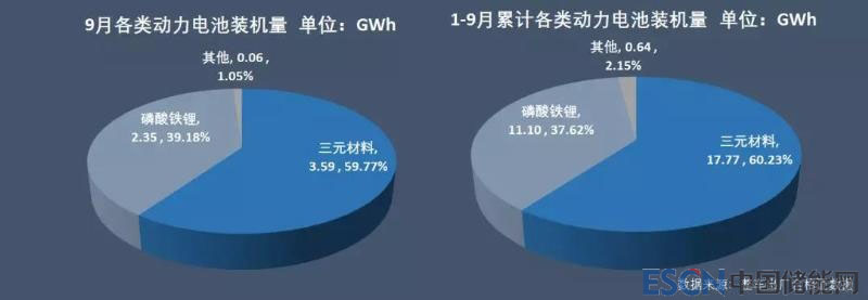 9月,磷酸鐵鋰電池在總體裝機(jī)量中的比重也從上個(gè)月的35.09%增加到39.16%,三元鋰電池的比重從上個(gè)月的63.2%下降到59.76%。