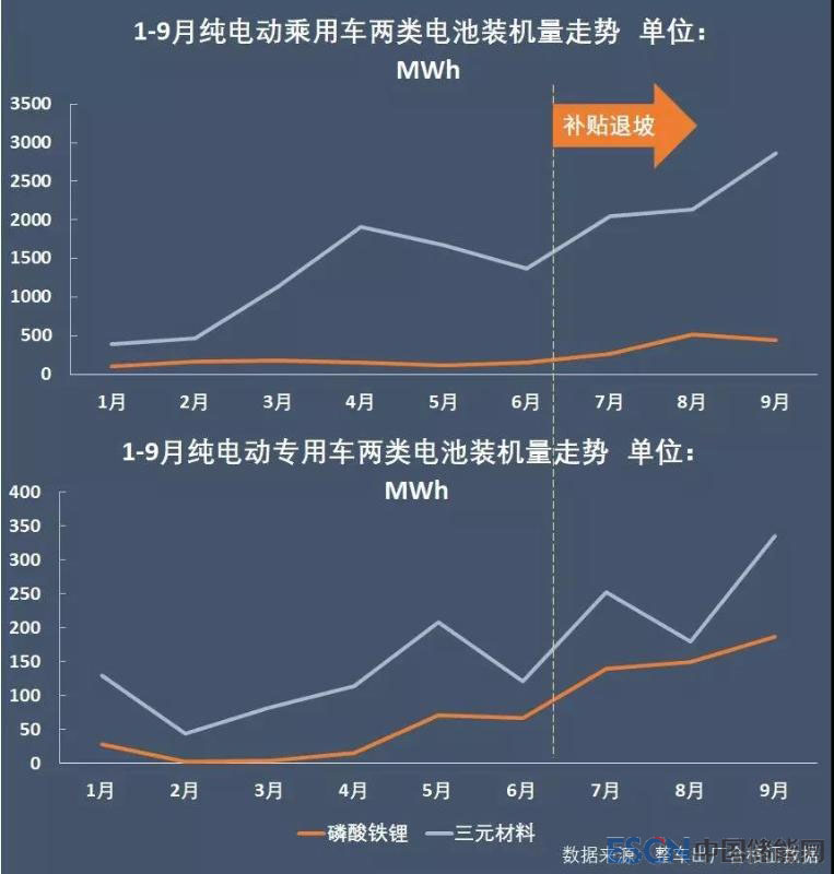 事實(shí)上,補(bǔ)貼退坡后三個(gè)月,磷酸鐵鋰電池裝機(jī)上漲勢頭強(qiáng)于三元鋰電池。