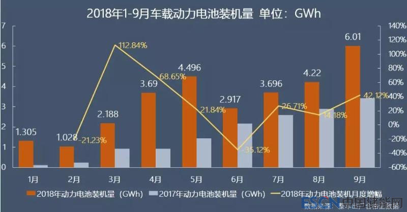9月份,國內(nèi)新能源汽車動(dòng)力電池裝機(jī)量6.01GWh,較上月增長42.12%,增幅提升明顯;同比亦大幅增長75.43%,較前兩個(gè)月的增幅繼續(xù)回升。