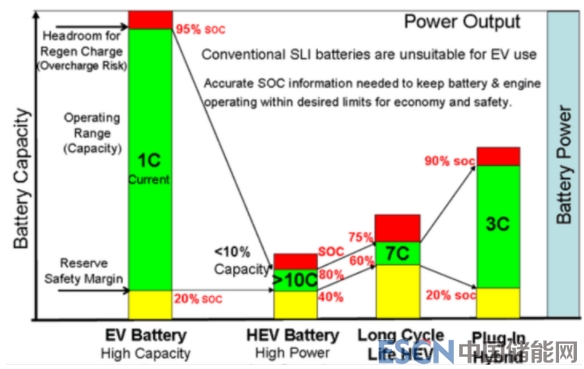 因?yàn)殡姵叵到y(tǒng)在EV和HEV所承擔(dān)的任務(wù)和角色的不同,決定了C值需求的不同。EV強(qiáng)調(diào)的是,大的續(xù)駛里程;HEV或PHEV強(qiáng)調(diào)的動(dòng)力性功率混合能力,包括大電流的能量回收能力。使用功能的差異性,也決定了其限值的不同。