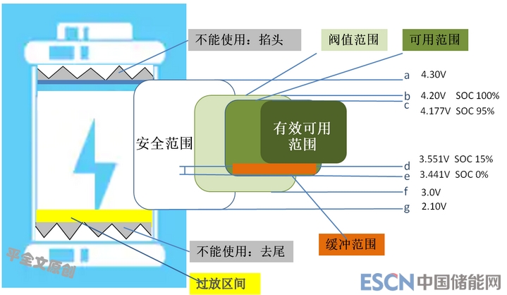 附圖一,借用全球知名品牌電池參數(shù)示意,SOC范圍、 SOC可用范圍,電池閥值范圍、安全范圍之間的包含關(guān)系。