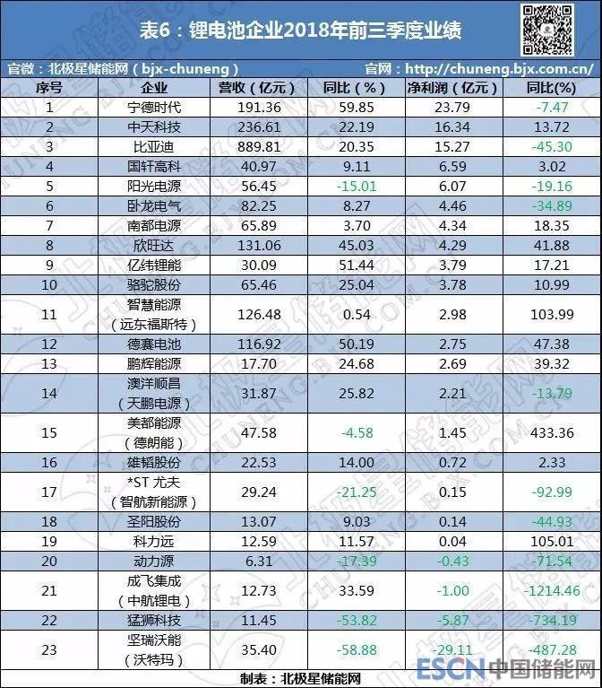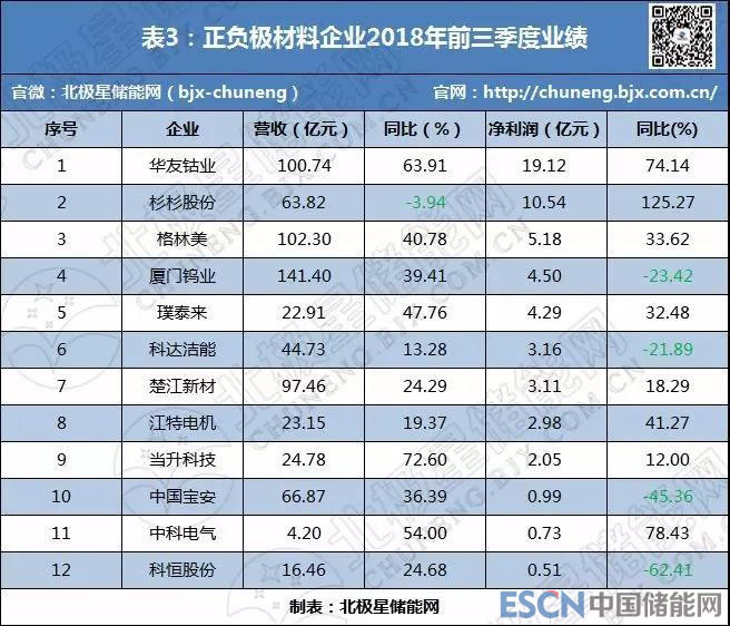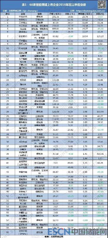 在業(yè)績(jī)?yōu)橥醯馁惖郎?,“叢林法則”是唯一的競(jìng)爭(zhēng)邏輯,有人稱(chēng)霸,自有人隕落。北極星儲(chǔ)能網(wǎng)通過(guò)對(duì)鋰電池、鋰電材料、鋰電設(shè)備等60家儲(chǔ)能領(lǐng)域上市企業(yè)前三季度業(yè)績(jī)統(tǒng)計(jì)發(fā)現(xiàn),近9成企業(yè)業(yè)績(jī)飄紅,僅8家出現(xiàn)虧損,其中寧德時(shí)代、華友鈷業(yè)、天齊鋰業(yè)分別以23.79億元、19.12億元和16.89億元的凈利潤(rùn)奪得前三甲,而堅(jiān)瑞沃能受沃特瑪債務(wù)危機(jī)拖累則巨虧29.11億元,成為名副其實(shí)的“虧損王”。但值得注意的是,這60家企業(yè)中凈利潤(rùn)增速超過(guò)50%的僅有10家,而凈利潤(rùn)下滑的企業(yè)卻多達(dá)近半數(shù)(詳見(jiàn)表1)。