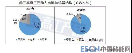 GGII數(shù)據(jù)顯示,在三元動力電池下游終端結(jié)構(gòu)中,2018年前三季度乘用車裝機(jī)量占比91%,較去年同期占比上升12個百分點(diǎn)。