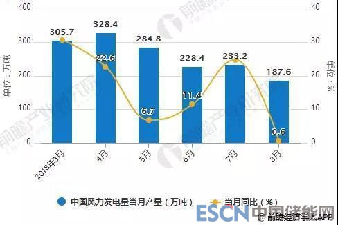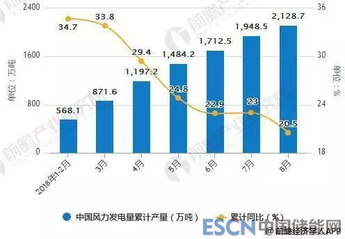 2018年1-8月中國風(fēng)力發(fā)電量產(chǎn)量統(tǒng)計(jì)及增長情況