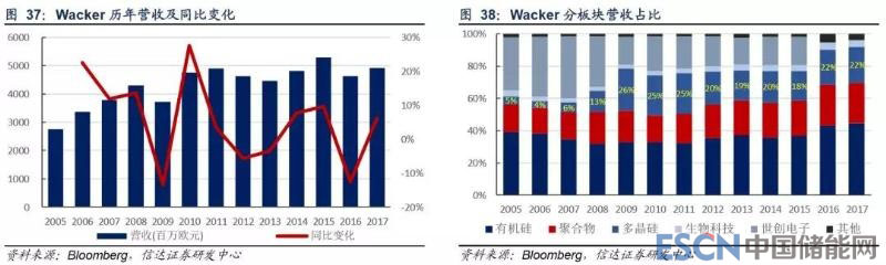 瓦克是一家在硅和乙烯化學(xué)領(lǐng)域具有國際領(lǐng)先水平的跨國企業(yè),當(dāng)前業(yè)務(wù)板塊包括有機(jī)硅、聚合物、多晶硅和生物科技等,并在有機(jī)硅、多晶硅及聚合物板塊中的乳膠粉和 VAE 共聚乳液等領(lǐng)域占據(jù)全球龍頭地位。近年來多晶硅板塊占公司整體營收 的比重在 20%左右。
