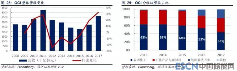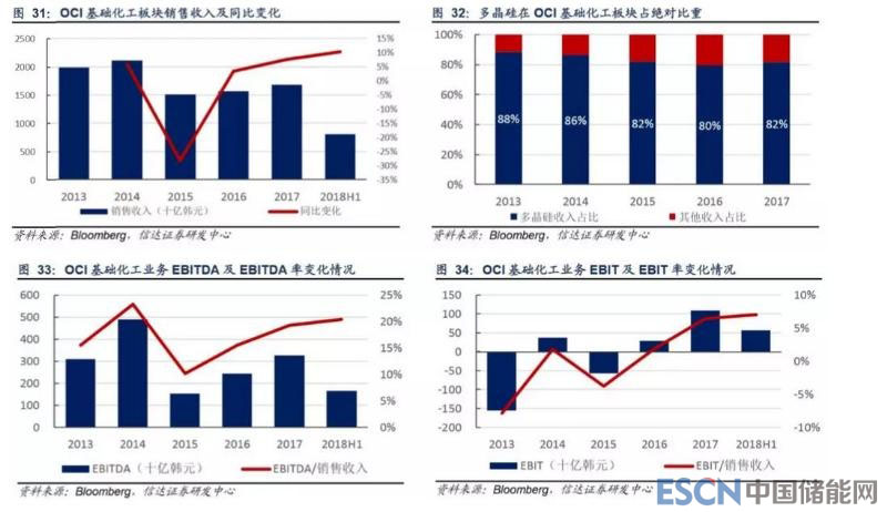 OCI 為韓國企業(yè),成立于 1959 年,從化工業(yè)務(wù)起家。目前已形成基礎(chǔ)化工、石化產(chǎn)品與碳材料、能源解決方案三大業(yè)務(wù)板塊。 其中多晶硅產(chǎn)品屬基礎(chǔ)化工板塊;同時(shí) OCI 在美國和中國開展光伏電站運(yùn)營業(yè)務(wù),即能源解決方案板塊。受光伏電站運(yùn)營業(yè) 務(wù)收入迅速增長影響,其基礎(chǔ)化工板塊營收占比呈下降趨勢,2017 年為 44%。