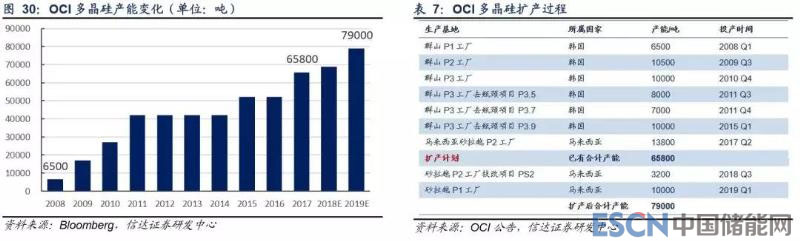 2017 年 5 月,OCI 出資 1.73 億美元收購日本德山位于馬來西亞砂拉越的多晶硅工廠,截至 2017 年底,該工廠產(chǎn)能為 1.38 萬噸,其整體產(chǎn)能提升至 6.58 萬噸,預(yù)計(jì)砂拉越工廠兩個(gè)擴(kuò)產(chǎn)項(xiàng)目將分別于 2018Q3 和 2019 投產(chǎn),投產(chǎn)后 OCI 總產(chǎn)能將達(dá) 7.9 萬噸。未來,OCI 兩大生產(chǎn)基地中,韓國工廠定位高質(zhì)量的單晶及半導(dǎo)體用多晶硅生產(chǎn),馬來西亞工廠定位提供有成本優(yōu) 勢的單晶和高效多晶用多晶硅生產(chǎn)。