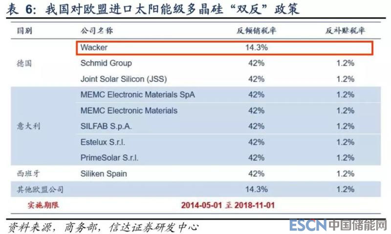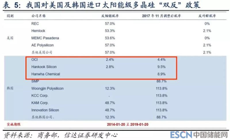 我國自 2012 年啟動(dòng)對歐、美、韓進(jìn)口多晶硅“雙反”立案調(diào)查,并于 2014 年做出最終裁定,其中對美韓產(chǎn)品實(shí)施期限為 5 年,2017 年 11 月期中復(fù)審提高對韓反傾銷稅率;對歐盟進(jìn)口產(chǎn)品實(shí)施期限為 2 年,后經(jīng)復(fù)審終裁,延長至 2018 年底。從“雙 反”征稅具體企業(yè)來看,我國對 OCI、韓國硅業(yè)(Hankook)、瓦克(Wacker)三大主要進(jìn)口企業(yè)征收關(guān)稅相對較低,而對美國進(jìn)口企業(yè)及其余歐洲企業(yè)征收關(guān)稅額度較高,我們接下來對海外多晶硅龍頭企業(yè)進(jìn)行分析,通過其多晶硅業(yè)務(wù)發(fā)展?fàn)顩r觀 測未來替代其產(chǎn)能的可能性。