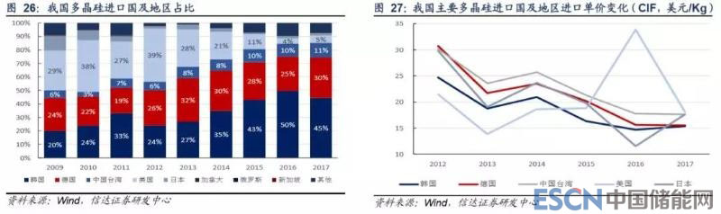 從具體進(jìn)口來源來看,韓國是我國第一大多晶硅進(jìn)口國,占我國進(jìn)口總量的 45%左右,而且由于 OCI、Hankook 等企業(yè)進(jìn)口 關(guān)稅相對較低,近年來進(jìn)口量占比呈擴(kuò)大趨勢;德國是第二大進(jìn)口國,進(jìn)口量占 30%左右,主要為 Wacker 產(chǎn)多晶硅產(chǎn)品; 臺(tái)灣沒有多晶硅產(chǎn)能,美國等國生產(chǎn)企業(yè)借道臺(tái)灣以規(guī)避“雙反”征稅,但美國+臺(tái)灣整體進(jìn)口量占比呈下滑趨勢,目前在 15% 左右。