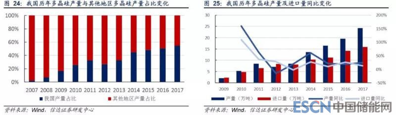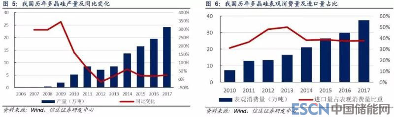 2017 年我國多晶硅產(chǎn)量為 24.20 萬噸,全球除我國外產(chǎn)量為 20 萬噸,我國產(chǎn)量占比已過半數(shù),但由于國內(nèi)需求更大,我國 仍需進(jìn)口多晶硅以滿足國內(nèi)需求,近年來我國多晶硅進(jìn)口量增速雖整體低于產(chǎn)量增速,但仍以兩位數(shù)增長,2017 年我國多晶 硅進(jìn)口量為 15.89 萬噸,同比增長 13%。