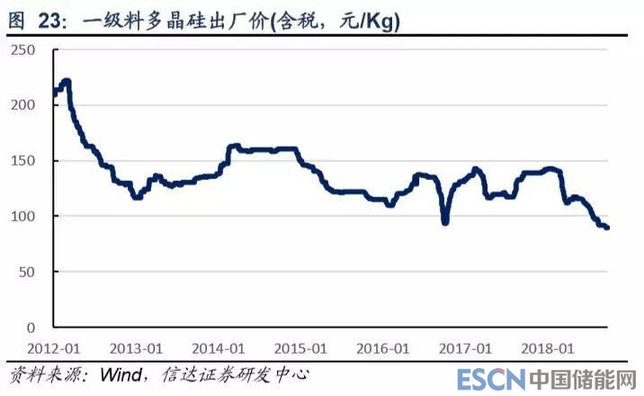 今年以來,受國內(nèi)新增產(chǎn)能投產(chǎn)以及 531 新政對產(chǎn)業(yè)鏈的沖擊,多晶硅價(jià)格持續(xù)下降,截至 2018 年 9 月底,國內(nèi)多晶硅一 級料出廠價(jià)為 89.43 元/Kg,已創(chuàng) 2012 年以來新低。但我們認(rèn)為,受光伏平價(jià)上網(wǎng)進(jìn)程加速影響,降低多晶硅價(jià)格是降低電 站單位投資成本的重要部分,我們預(yù)計(jì)未來多晶硅價(jià)格大幅反彈的概率較小,大概率仍將呈震蕩下行趨勢。