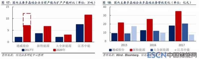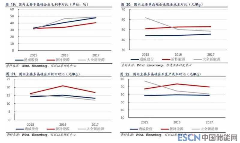 從四家企業(yè)營收規(guī)模來看,江蘇中能由于股東保利協(xié)鑫同時(shí)從事硅片業(yè)務(wù),對外銷售多晶硅數(shù)量較少,營收規(guī)模較小,新特 能源由于多晶硅產(chǎn)能較大,營收規(guī)模較大,2017 年?duì)I收為 35 億元,通威永祥和大全新能源 2017 年多晶硅營收分別為 18 和 20 億元。