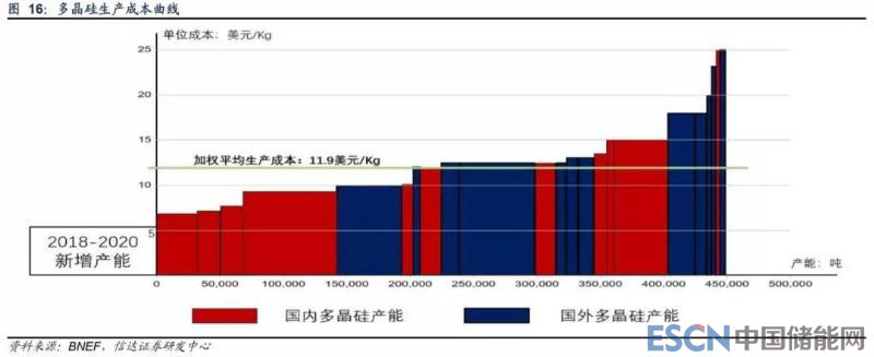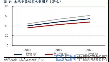 結(jié)果表明,未來全球光伏級多晶硅將保持持續(xù)增長態(tài)勢。一般情形下,2018-2020 年全球光伏級多晶硅需求分別為 40.1、48.1 和 54.5 萬噸;樂觀情形下分別為 44.2、53.7 和 61.1 萬噸。而目前全球萬噸級多晶硅生產(chǎn)企業(yè)產(chǎn)能合計(jì)約 47 萬噸,考慮到高 成本產(chǎn)能競爭力下降以及電子級多晶硅產(chǎn)能占一定比例,我們認(rèn)為目前全球光伏級多晶硅供需相對偏緊。