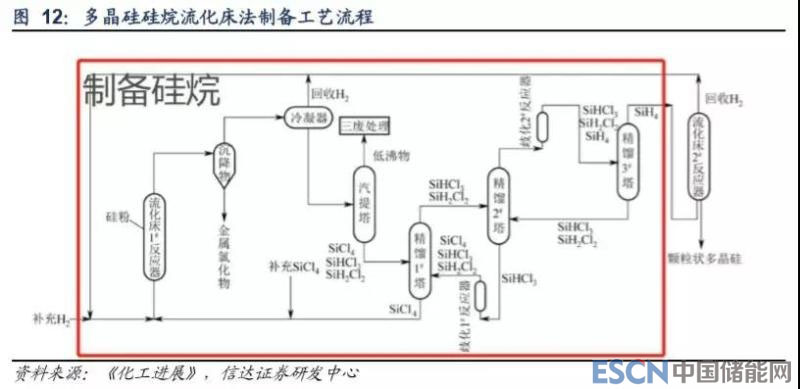 與改良西門子法相比,硅烷法熱解時(shí)溫度低,同時(shí)流化床反應(yīng)器可增大反應(yīng)面積、提高生產(chǎn)效率,所以還原電耗低于改良西 門子法。另外,由于不需要更換硅芯、配臵碳電極,硅烷法可實(shí)現(xiàn)連續(xù)化生產(chǎn)。但是,硅烷法建設(shè)成本高,導(dǎo)致其在綜合成本方面不占優(yōu)勢;另外,硅烷法對安全性要求高,且生產(chǎn)的多晶硅純度較差。目前全球龍頭中主要有挪威 REC 公司采用硅烷法。