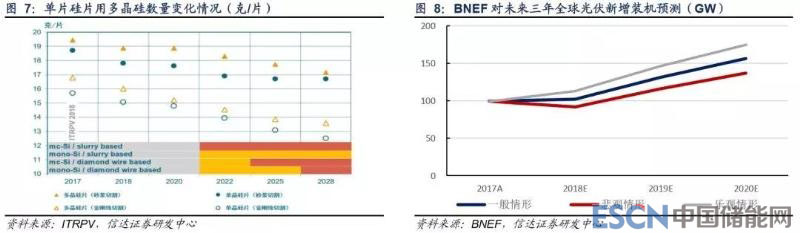我們根據(jù)國際光伏技術(shù)路線圖(ITRPV)中對單片硅片耗硅量變化的預(yù)計(jì),結(jié)合對未來光伏轉(zhuǎn)換效率的預(yù)計(jì),得出了多晶硅 需求量與光伏裝機(jī)量之間的換算關(guān)系。根據(jù) BNEF 預(yù)計(jì),2018-2020 年,一般情形下全球光伏裝機(jī)為 103、131 和 156GW, 樂觀情形下為 113、147 和 175GW。我們根據(jù)以上數(shù)據(jù)對未來全球光伏級多晶硅需求量進(jìn)行簡單測算。