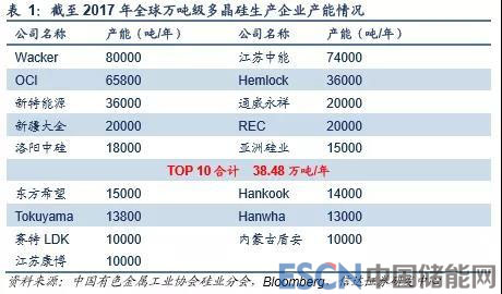 據(jù)我們統(tǒng)計(jì),截至 2017 年底,全球多晶硅生產(chǎn)企業(yè)中,產(chǎn)能達(dá)到萬噸級以上的不足 20 家企業(yè),其中瓦克、江蘇中能和 OCI 分別擁有 8.0、7.4 和 6.58 萬噸,位于行業(yè)前三位,行業(yè)前 10 企業(yè)合計(jì)擁有產(chǎn)能 38.48 萬噸,市場集中度較高。至 2017 年 底,我國在產(chǎn)多晶硅企業(yè)有 22 家,同比增加 5 家,有效產(chǎn)能共計(jì) 27.6 萬噸/年,同比增長 6.6 萬噸/年。