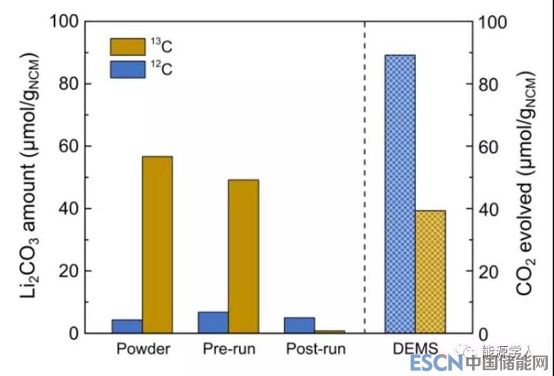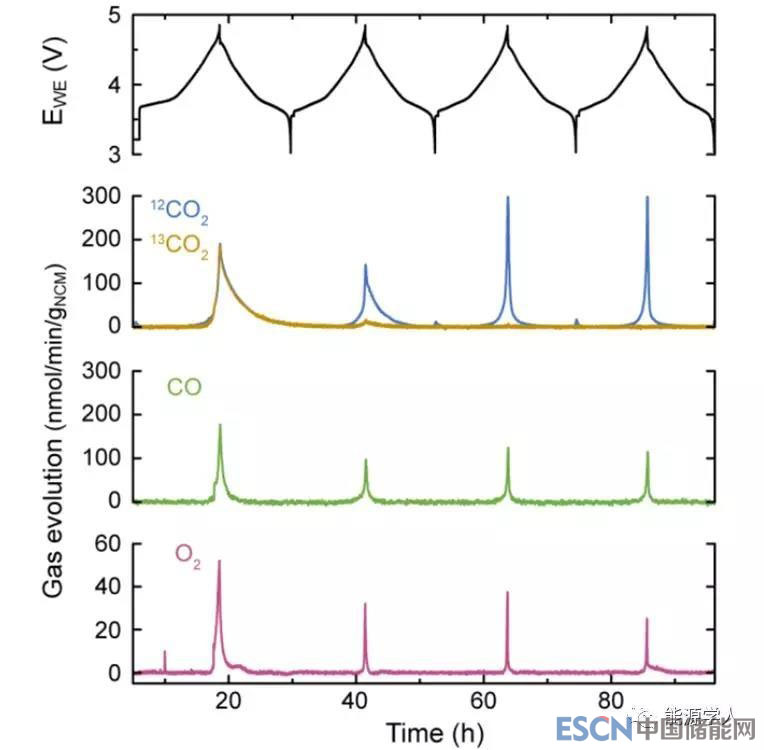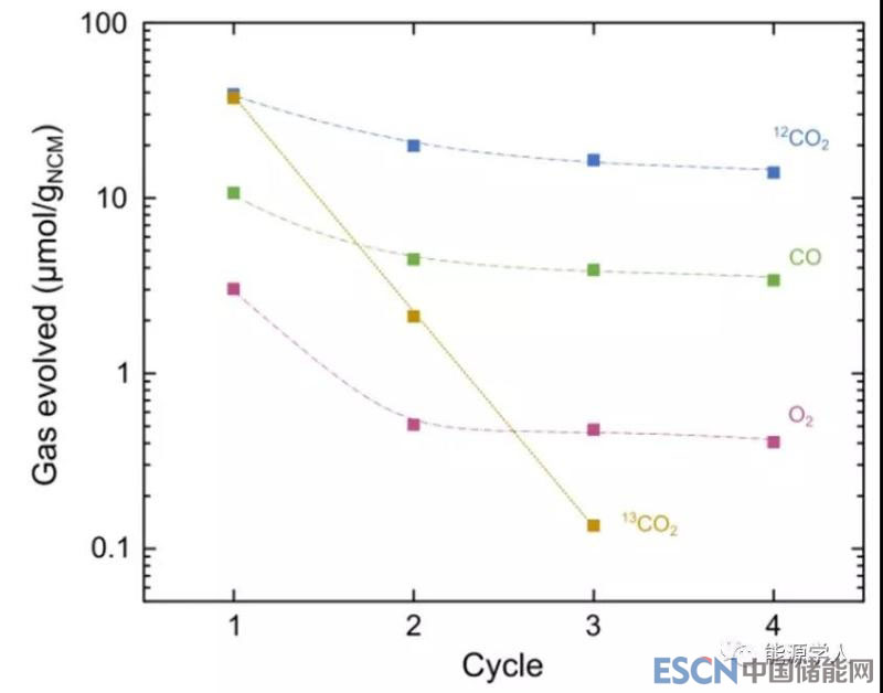 在排除電解液干擾的條件下,NCM中逸出的氧原子是電池中CO2的主要來源。