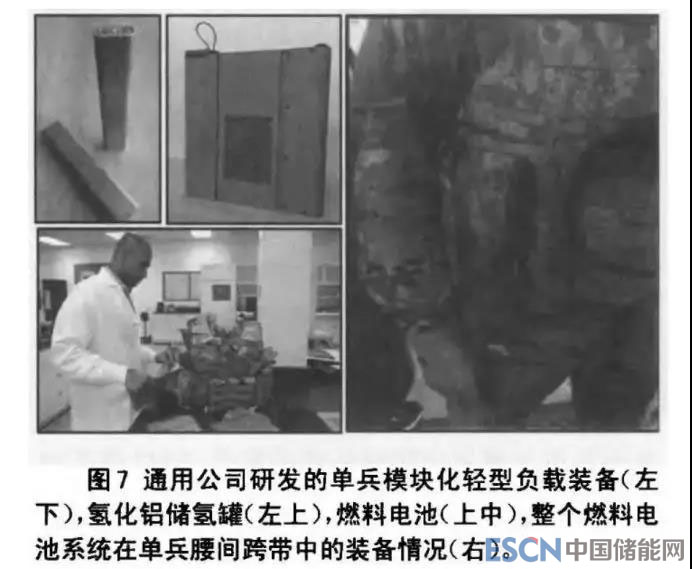 該款氫燃料電池可見圖7。圖7(左下)為通用公司研發(fā)的單兵模塊化輕型負載裝備,圖7(左上)為氫化鋁儲氫罐,圖7(上中)為燃料電池,圖7(右)為整個燃料電池系統(tǒng)在單兵腰間跨帶中的裝備情況。