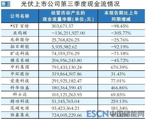 記者注意到,在已公布季報的光伏企業(yè)中,有13家企業(yè)披露了報告期內(nèi)經(jīng)營活動產(chǎn)生的現(xiàn)金流量凈額,6家企業(yè)較去年同期相比呈負(fù)增長,其中拓日新能(股票代碼:002218)、*ST百特(股票代碼:002323)較去年同期分別下降98.45%和92.19%,而亞瑪頓的這一數(shù)值甚至達(dá)到了-305.77%(見表2)。