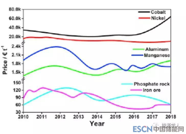 生產(chǎn)成本無疑是產(chǎn)業(yè)化必須要考慮的問題之一,本文作者總結(jié)了近年來組成Li嵌入式正極材料的金屬元素的市場價格,如圖5。其中元素Co和元素Ni的價格普遍高于元素Al和元素Mg,而元素P和Fe具有相對更低的價格。值得注意的是元素Co從2016年起,價格飛升,這無疑會提升基于元素Co等LCO等正極材料的成本,對其更大的規(guī)模化發(fā)展有一定影響。