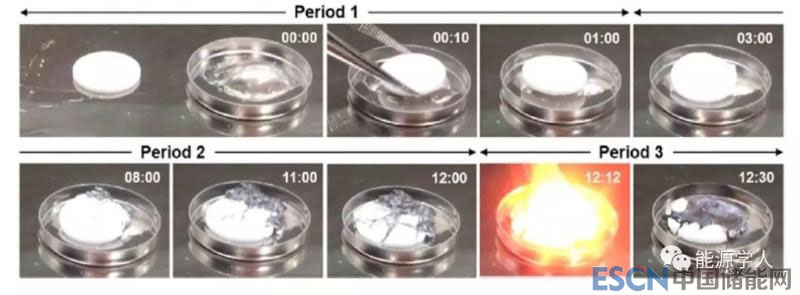 安全性是固態(tài)電解質(zhì)的巨大優(yōu)勢,但是固態(tài)電解質(zhì)并不是絕對的安全,本文作者列舉了Chung and Kang等人的工作,如圖4所示,將Li1.5Al0.5Ge1.5(PO4)3 pellet放置在熱融化的金屬鋰上面,隨著時間的推移,固態(tài)電解質(zhì)依舊會燃燒,盡管其融點大于1100℃,這主要是由于電解質(zhì)與金屬負極在高溫狀態(tài)下不穩(wěn)定導(dǎo)致的。同樣,正極材料能否在高溫下保持穩(wěn)定也決定著鋰電池的最終安全性。作者綜述了Li嵌入式正極材料的安全性具有LFP > LMO > NMC >NCA > LCO的排列順序。LFP具有最好的安全性,Mn元素能夠提高正極材料的熱穩(wěn)定性,但Ni和Co元素對于材料的熱穩(wěn)定性則是不利的。