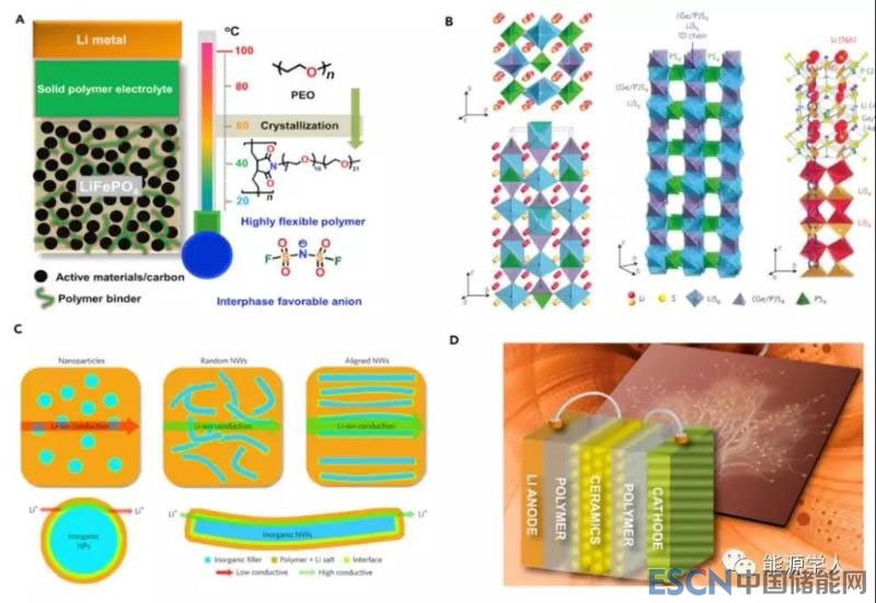 固態(tài)電解質(zhì)包括聚合物固態(tài)電解質(zhì)、無機固態(tài)電解質(zhì)以及聚合物-無機復(fù)合固態(tài)電解質(zhì),固態(tài)電解質(zhì)從發(fā)現(xiàn)到現(xiàn)在已經(jīng)有40多年,然而僅有基于聚合物電解質(zhì)的Li/PEO/LFP電池在Bollore Bluecar中得到了應(yīng)用,但是其必須搭載加熱裝置使電池在70℃進行工作,這主要是因為使用半結(jié)晶的PEO電解質(zhì)造成的。那么,能否開發(fā)室溫固態(tài)電解質(zhì)呢?本文介紹了Armand等人設(shè)計出了一種室溫聚合物(Jeffamines)電解質(zhì),其匹配的Li/LFP電池能夠在室溫下具有很高的電導(dǎo)率并且表現(xiàn)出優(yōu)異的界面性能,如圖3A所示。另外,Kamaya等人報道了Li10GeP2S12(LGPS)無機固態(tài)電解質(zhì)(圖3B),室溫下離子電導(dǎo)率能夠達到1.23*10-2 S/cm,并且該固態(tài)電解質(zhì)能夠匹配LFP、LCO, NCA, LNMO等Li嵌入式正極。對于聚合物-無機復(fù)合固態(tài)電解質(zhì),早在1980s就有報道,在聚合物中加入納米Al2O3便能提高電解質(zhì)的機械性能和離子電導(dǎo)率,最近幾年,Cui等人將納米線狀的LLTO加入到PAN聚合物電解質(zhì)中從而顯著提升了其離子電導(dǎo)率,如圖3C所示。Goodenough等人提出了聚合物-無機陶瓷-聚合物的“三明治”結(jié)構(gòu)的復(fù)合固態(tài)電解質(zhì)(圖3D),中間的陶瓷層阻止了鋰鹽中的陰離子的穿梭,從而提高了鋰離子遷移數(shù),但同時也帶來了體積膨脹,能量密度降低等問題。