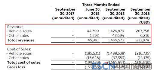 蔚來汽車自 2018 年 6 月才開始有銷售收入,2018上半年的銷售收入約為 4600萬元。3季度收入為14.69億元,同比增長(zhǎng)3095%